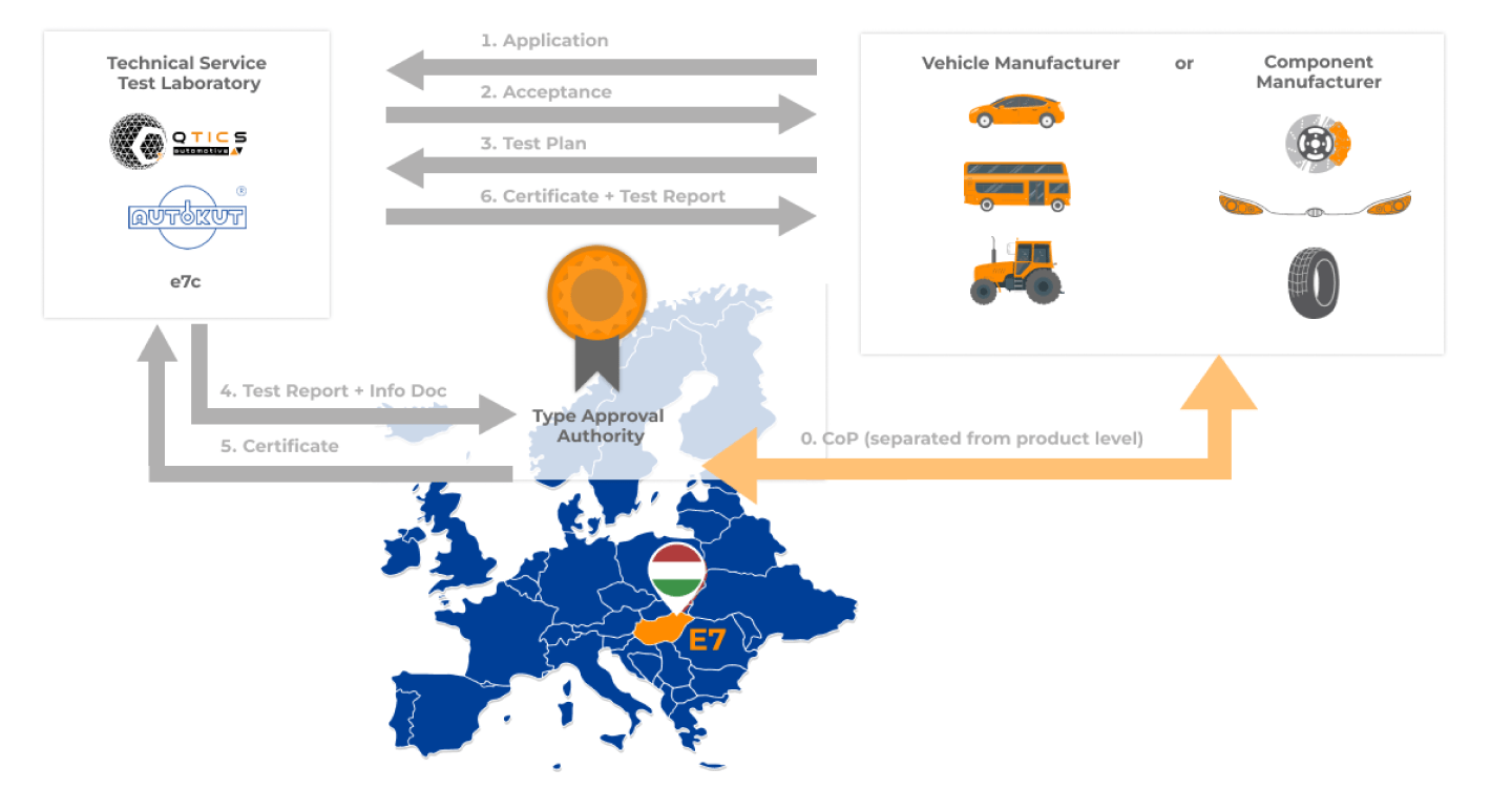A Típusjóváhagyási folyamat egy kötelező szabályozási keret az EU-n belül, amely biztosítja, hogy az új járművek és autóipari alkatrészek megfeleljenek a szigorú biztonsági, környezetvédelmi és teljesítménystandardoknak. A rendeletek által irányított folyamat harmonizálja az autóipari standardokat az EU tagállamai között, lehetővé téve a gyártók számára, hogy egyetlen jóváhagyással EU-szintű piaci hozzáférést nyerjenek. A QTICS Automotive Zrt. végigkíséri ügyfeleit a Típusjóváhagyási szolgáltatások teljes folyamatán — az első értékelésektől és tesztelésektől a dokumentáció benyújtásáig — biztosítva, hogy termékeik megfeleljenek a biztonság és a minőség minden követelményének. Az E7 Típusjóváhagyás megszerzésével a gyártók magabiztosan léphetnek be az EU piacára, tudva, hogy termékeik megfelelnek az összes alkalmazandó szabályozásnak.